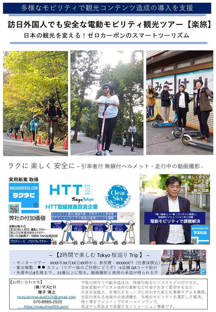 楽旅 (ラクタビ)観光地をガイドの引率のもと電動キックボードなどのゼロカーボンのモビリティで巡る体験型ガイドツアーです。①引率付き ②インカム無線付きヘルメット走行中もガイド案内と参加者の意思疎通が可能③引率者がツアー中のシーンを動画撮影し、編集データとして参加者に提供することで、SNS拡散により地域PRに寄与します。この要素をパッケージ化し実用新案と商標登録しています。