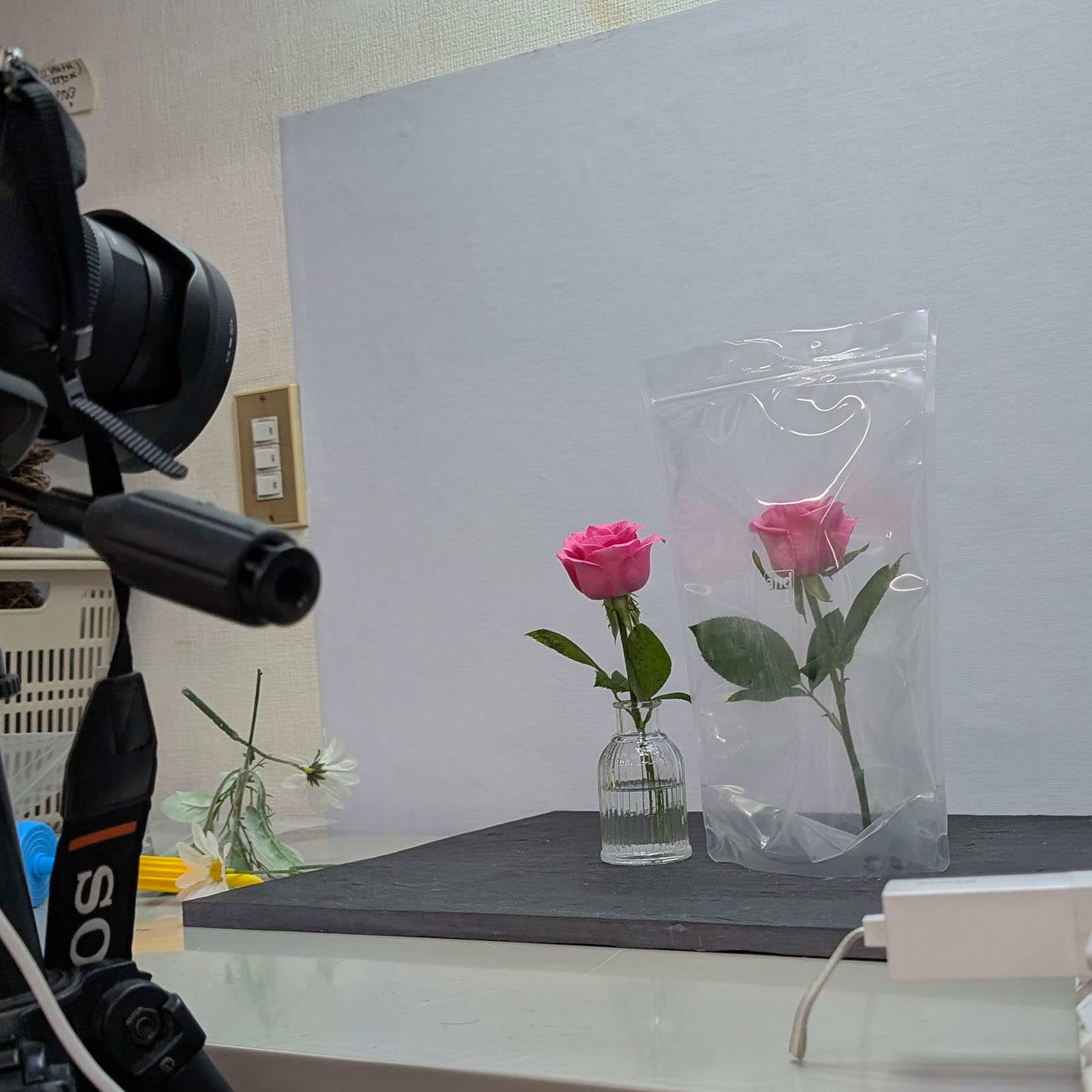 当社のブースでは、生花のノベルティを配布して、日常に花を取り入れる楽しさをお伝えします。袋から出して楽しむ際の方法として、花瓶や適した花の活け方、バランスやコツなどもご紹介します。季節の花やさまざまな種類を実際に見て触れながら体験し、家のどこにどう取り入れられるかを想像してください。また、水入りの花瓶よりも、当商品を袋のまま置いておく方がより新鮮で長持ちすることを、並べて比較した枯れ方の実験映像で確認できます。
