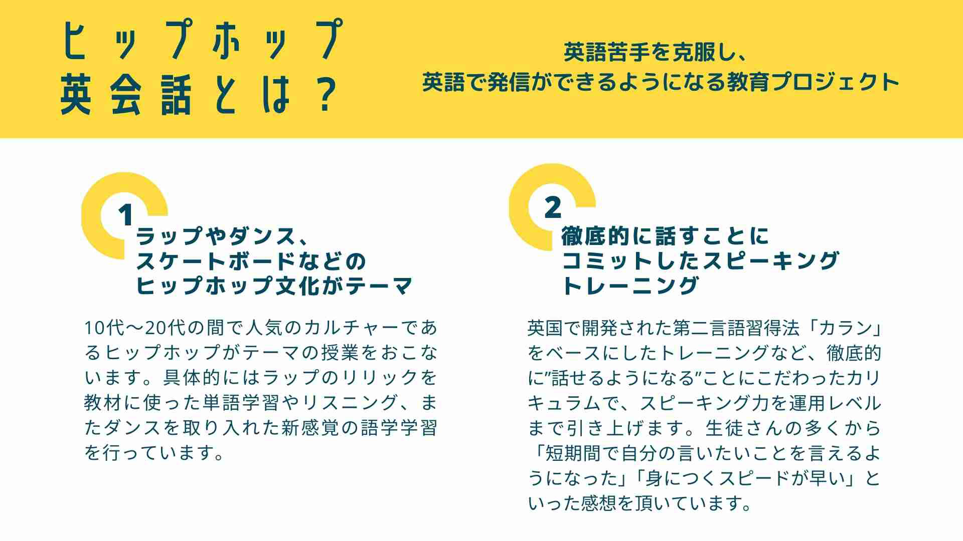 多くのダンサーやラッパーが受講する自社制作の教育コンテンツ「ヒップホップ英会話JUICE」を展示します。オリジナルの教材による英語学習のカリキュラムを提供します。 これまでの教育環境に馴染めなかった人々が、文化的に共鳴する人々と共に学びあうことができます。書籍「ヒップホップ英会話入門JUICE」やアプリ「JUICE」でヒップホップ英会話JUICEの世界観を体験してもらうことができます。