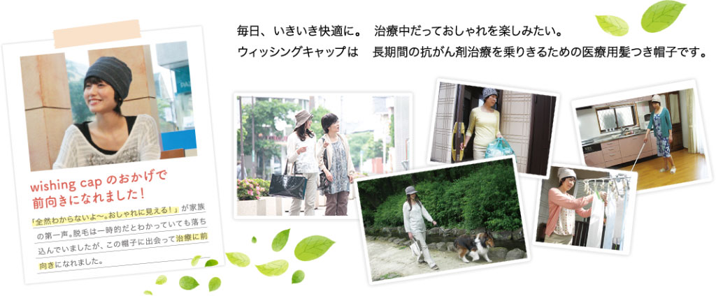 医療用髪つき帽子「ウィッシングキャップ」は、簡単に取外しできる髪が付いた帽子です。抗がん剤治療や脱毛症などで一時的に髪を失った患者さまのために開発されました。創業者本人の体験をもとに、さまざまな工夫が施されています。実際に手に取って&かぶって体験できます!「がん」について考える機会にもなればと思います。是非お立ち寄りください。心よりお待ちしております。
