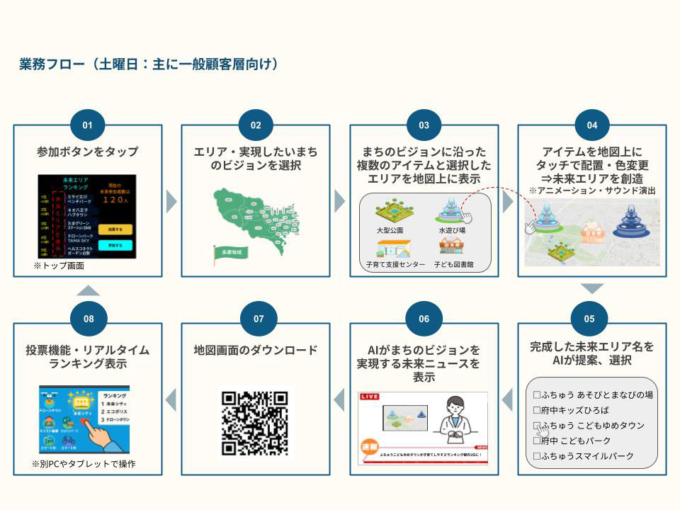 タッチ操作で“みらいのまち”をつくる、参加型のシミュレーション体験「まちラボ(多摩のまちづくりシミュレーションラボ)」を展示します。\n地図上に建物や乗り物などのアイテムを配置すると、自分が作りたい未来のまちを実現させることができます。\n完成したまちは記念撮影やSNS投稿もOK!親子で楽しく、多摩の魅力とテクノロジーを学べます。人気投票でランキング発表も予定しています。