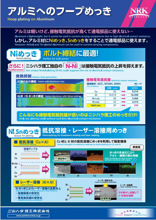 金属材料にめっき加工を行い、通電性、はんだ付けなどの機能を持たせる技術は、皆様の使用する電子機器、自動車など多岐にわたり使用されています。我々ニシハラ理工のめっき加工製品は、直接、目に触れることは少ないものですが、皆さんの生活に密接に繋がっています。実際に、銅とアルミの重さの違いなどを感じて頂き、なぜ表面処理が必要な技術なのか知って頂ける機会になると思います。ぜひ、ご来場ください。